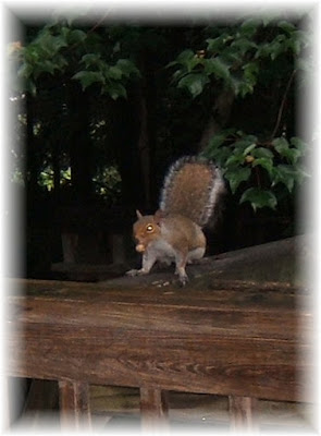 ...because these little guys, who brave even the nastiest winter weather to get their peanut treats, discovered they could come down the tree branches and scurry across the swingset to the deck, not once having to go down to the yard to work their way through the (sometimes) knee deep snow! The squirrels realized it was the perfect shortcut/bridge to the deck...